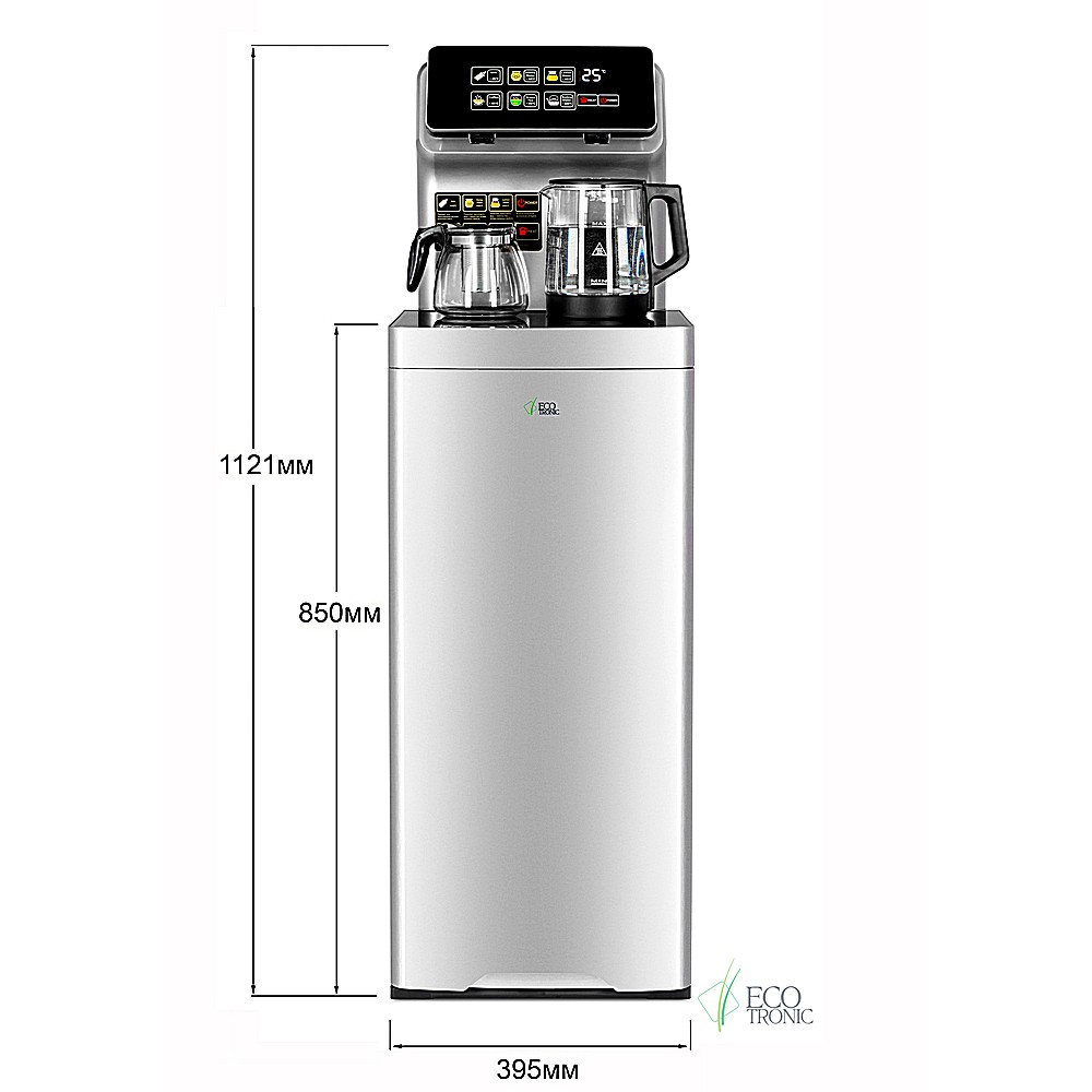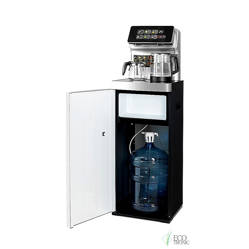 Большая и удобная панель управления с возможностью задать температуру нагрева (6 режимов нагрева). Пульт дистанционного управления. Нижняя загрузка бутыли. Два чайника — для кипячения и заварочный. Без охлаждения, только нагрев. Нагрев воды в чайнике до 100°С. Шкафчик для хранения.